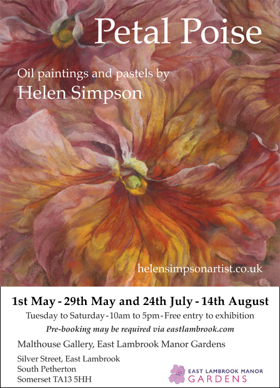 Due to Covid 19 Helen’s solo exhibition, Petal Poise (above) that was to take place in 2020 will now take place from the 1st – 29th May and 24th July – 14th August 2021. The first phase of the exhibition in May will be in the Gallery known as the Studio and will focus on Helen’s oil paintings and some of her ceramics. The second phase the exhibition in July/August will be an extended version, with works in the larger Malthouse Gallery as well as the Studio, and will feature oil paintings, pastels and ceramics. These galleries are set in East Lambrook Manor Gardens, in Somerset, well worth a visit in themselves. The exhibition however is free and there is no need to buy a ticket to the Gardens. There will be no need to book when you visit the exhibition in May, but numbers of visitors will probably be restricted to two persons in the Gallery at any one time. If you wish to see the Gardens you will need to buy a ticket www.eastlambrook.com, and check this website to discover if you will need to book to see the exhibition in July/August. |