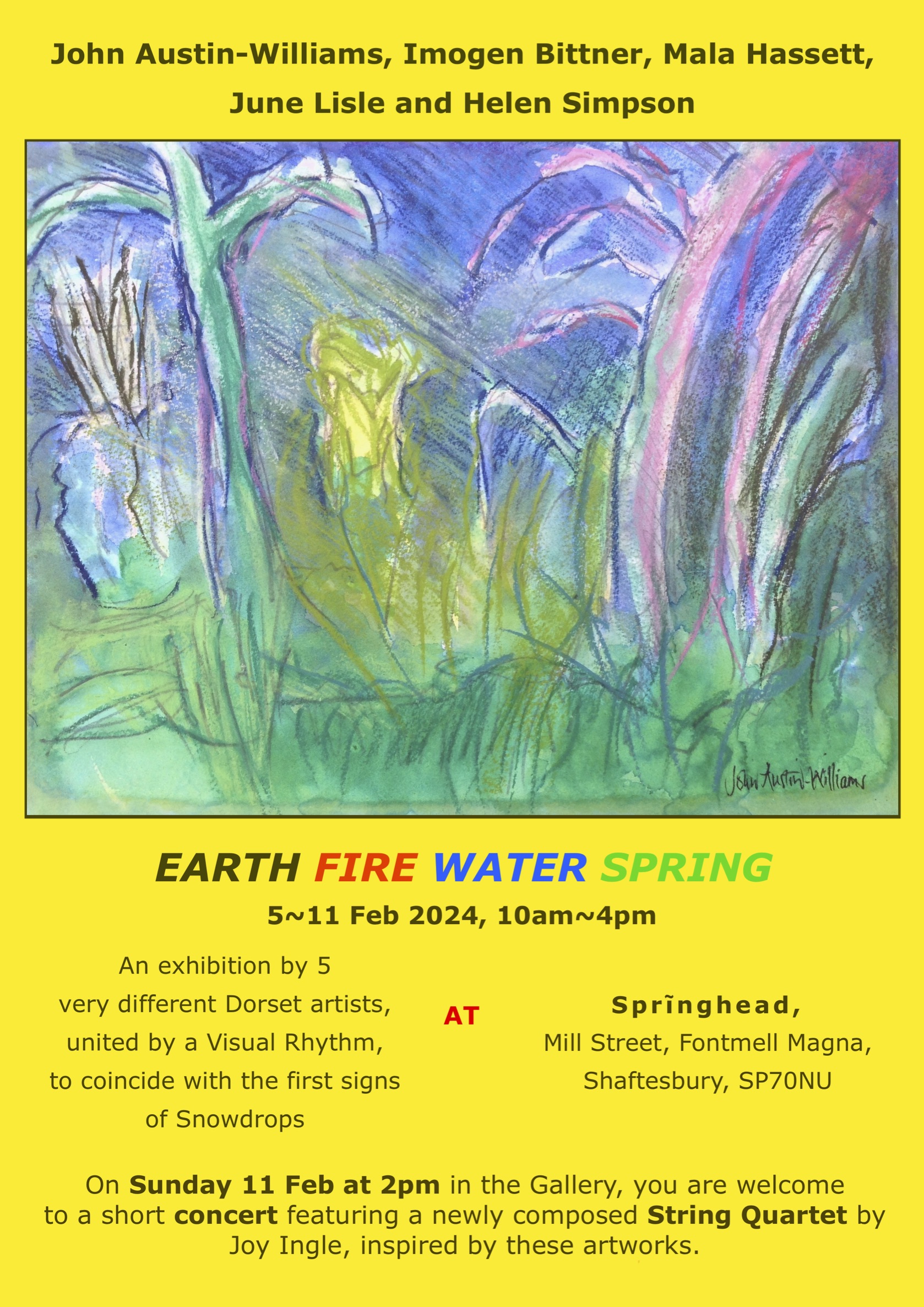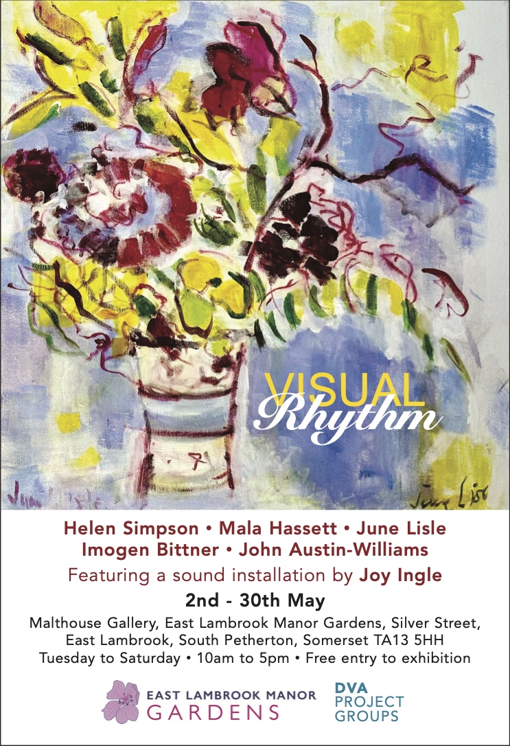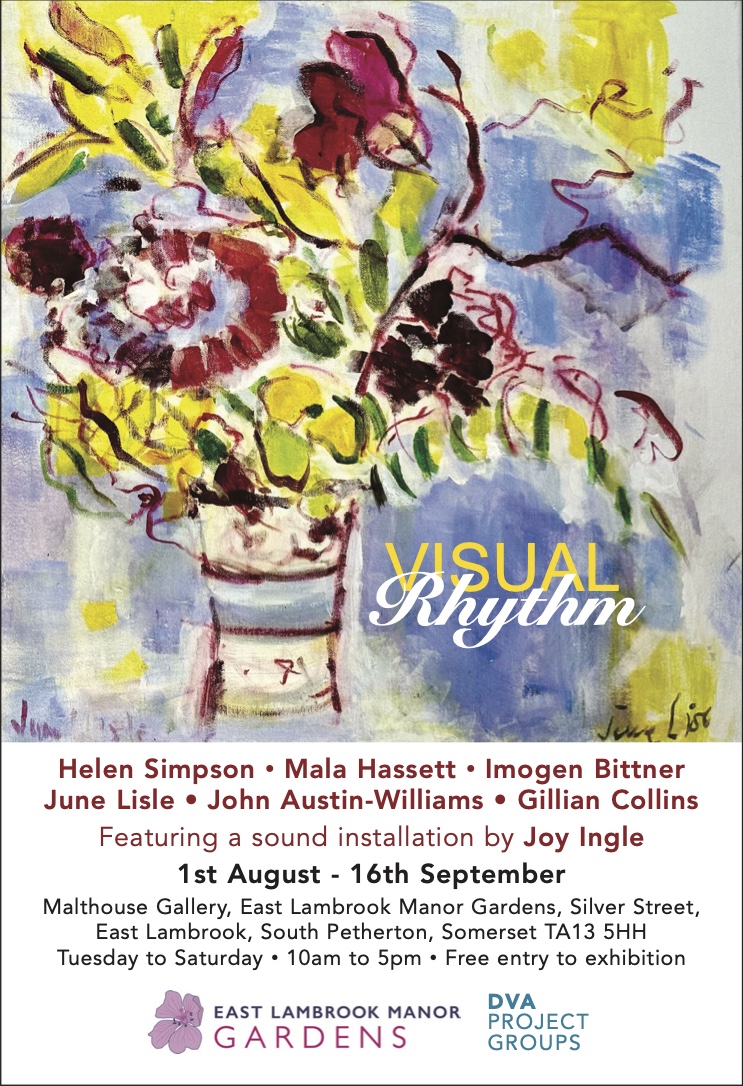 VISUAL RHYTHM brings together five members of the Dorset Salon (Dorset Visual Arts). Very different artists, whose work reflects the dynamic sensations found in music. Among the colours forms and marks in their work lie the echoes of a melody, a beat, or as the title describes a Visual Rhythm.